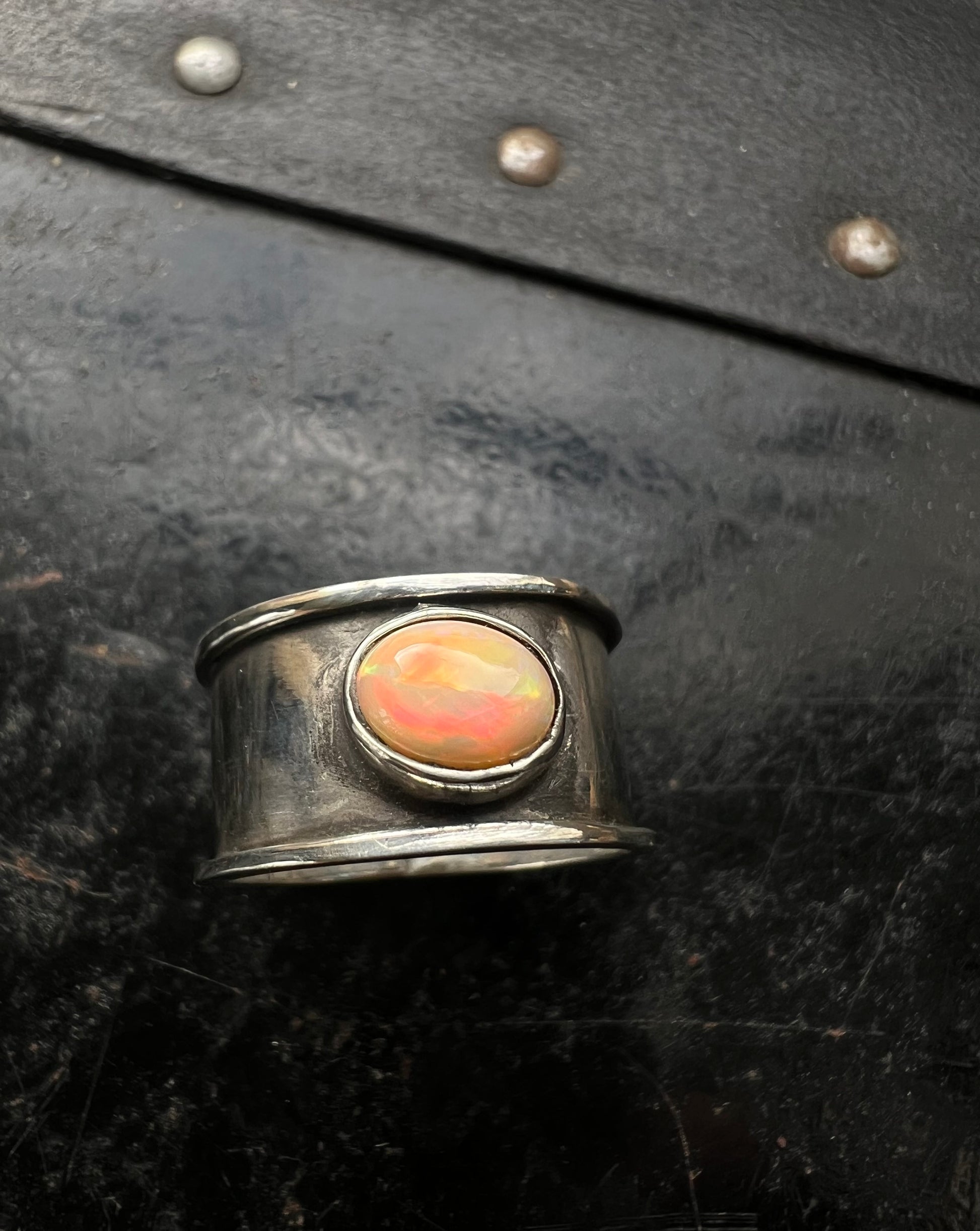 This ring celebrates with a gorgeous opal, with fiery colors reflecting the warm hues of a desert sunset. A stunning colored opal nestled in a sterling silver band. Handmade from scratch, one of a kind, and ready to ship!