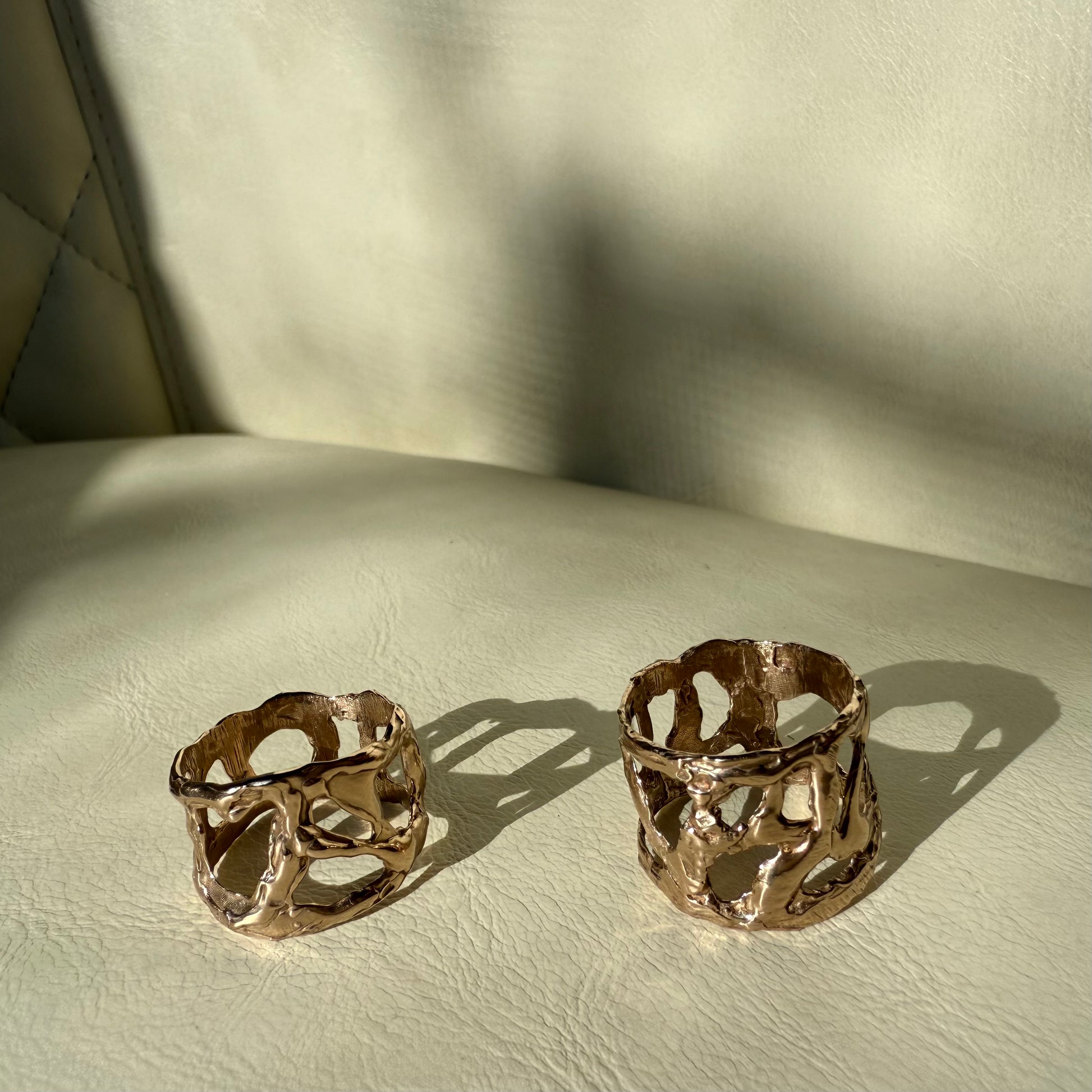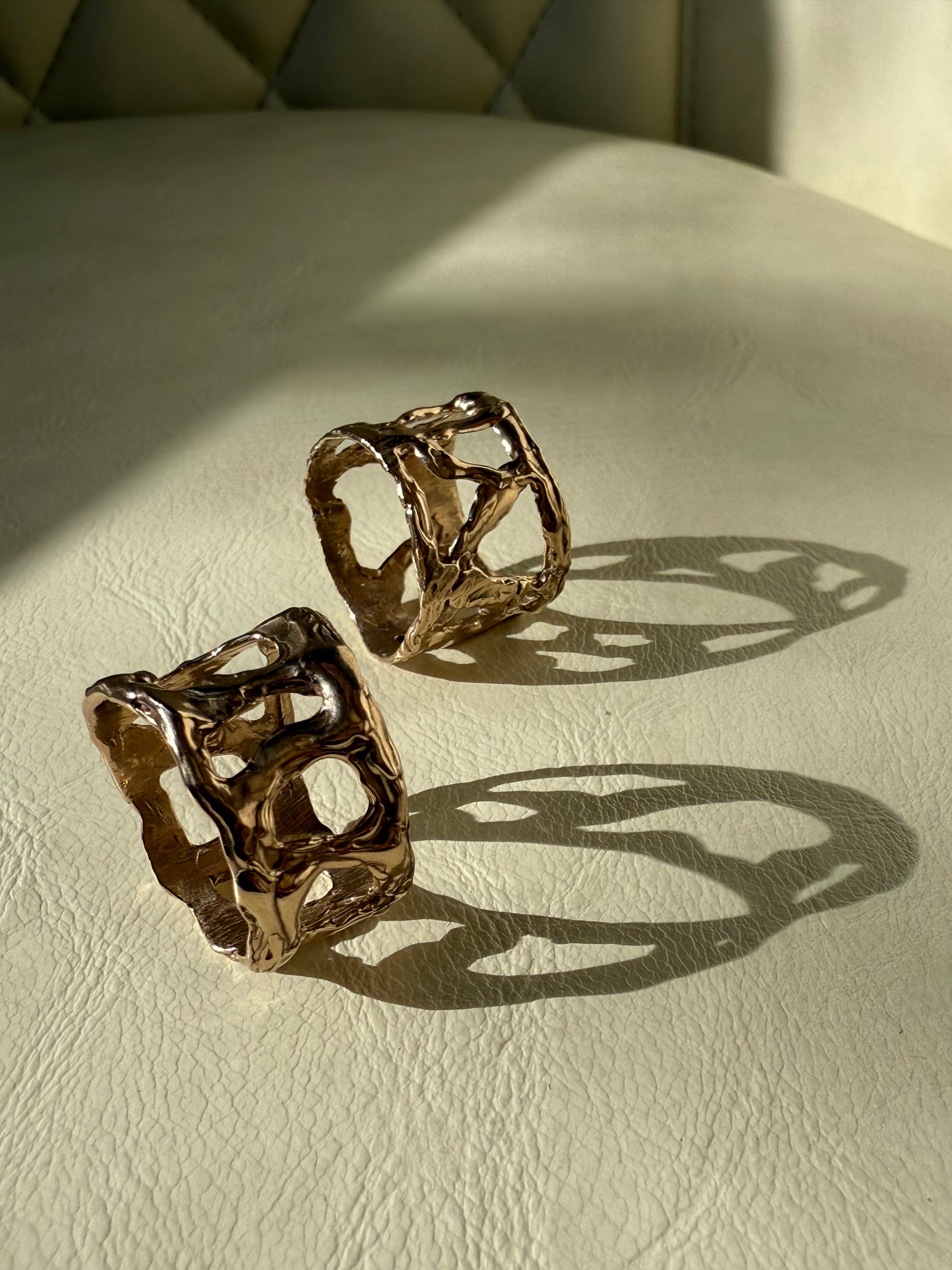 A hand-carved sculptural ring offered in 14k gold, sterling silver, or bronze. Each piece is hand carved in wax, then cast one at a time, and finished entirely by hand, giving each ring a unique and ancient-meets-modern presence with the feel of a true heirloom.